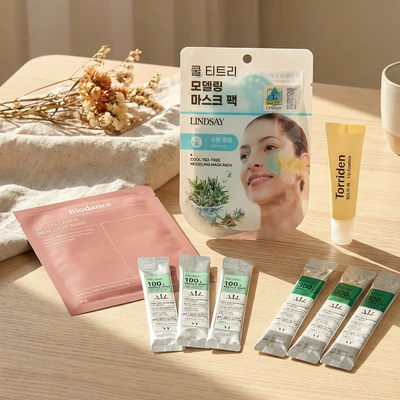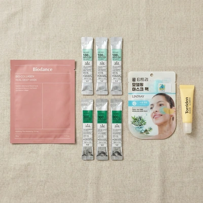 ───────────────── 「ソウル日和のキュレーション」 忙しいあなたのために選んだ ソウルのベストセラー4選。 BIODANCE バイオコラーゲンマスク (1枚) LINDSAY モデリングマスク (1回分) VT COSMETICS リードルショット 100 & 300 (各3包) TORRIDEN リップエッセンス (1本) (+ and a little gift for you) ─────────────────